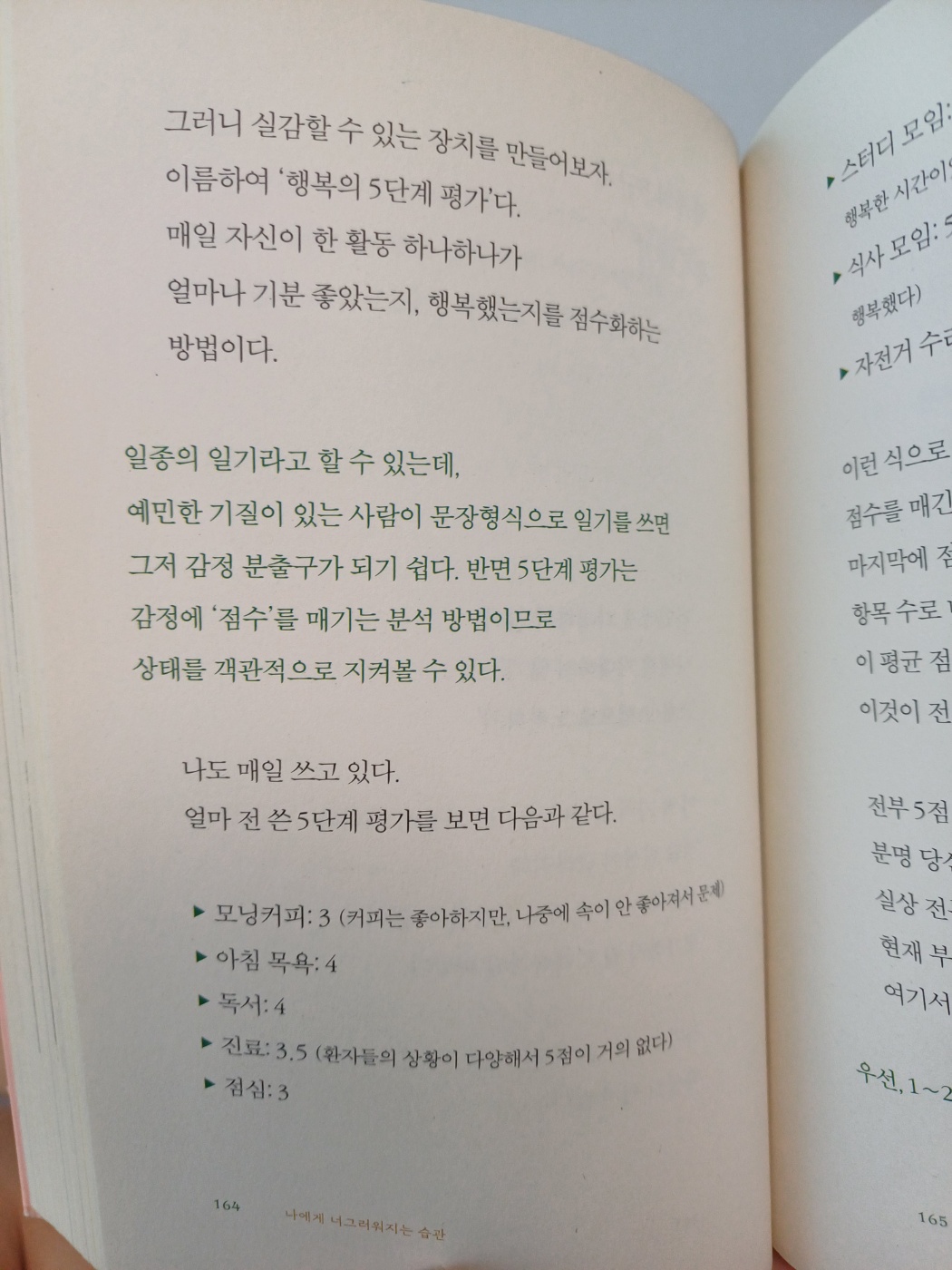 책내용중에 '행복의 5단계 평가'라는 부분이 있다. 매일 자신이 한 활동 하나하나 기분이 좋았는지 행복했는지를 점수화 하는 방법이다. 이 방법도 내가 구지 안 해도 될 것들과 노력해야 될 것들을 구체적으로 생각 할 수 있어서 좋았다.