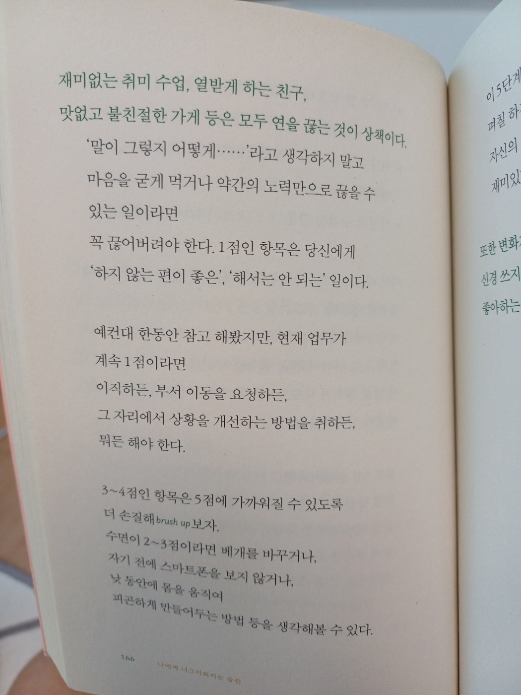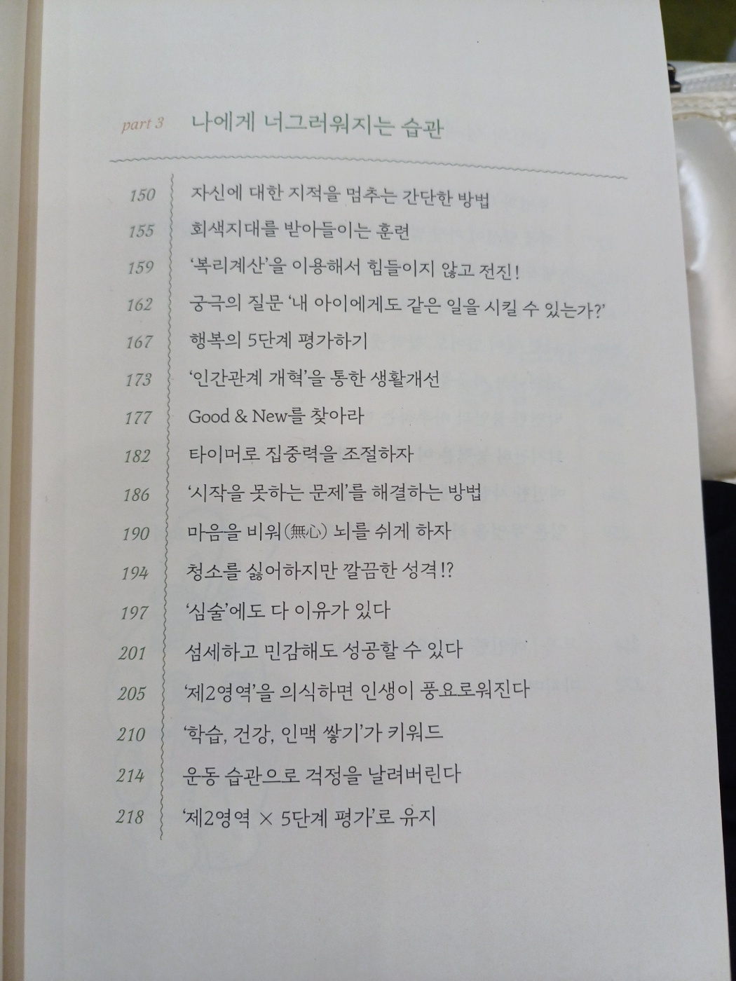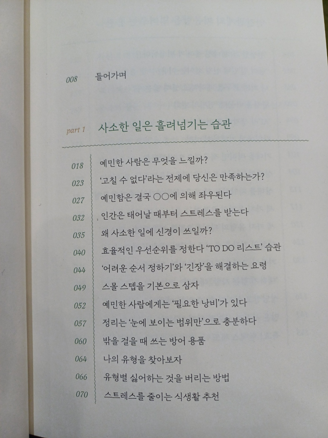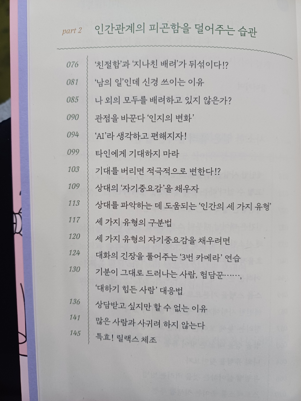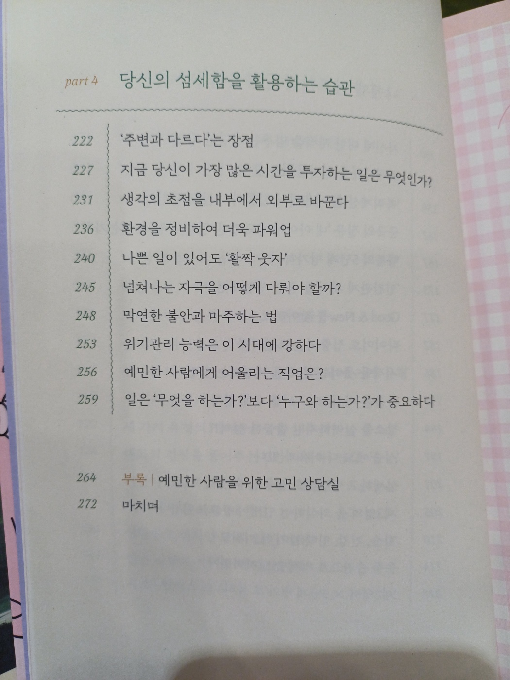 사소한 일은 흘러넘기는 습관, 인간관계의 피곤함을 덜어주는 습관, 나에게 너그러워지는 습관, 나의 섬세함을 활용한 습관 등을 네가지의 파트로 나뉘어져 있는데, 읽다보면 정말로 마음이 편안해지는 느낌이 든다.